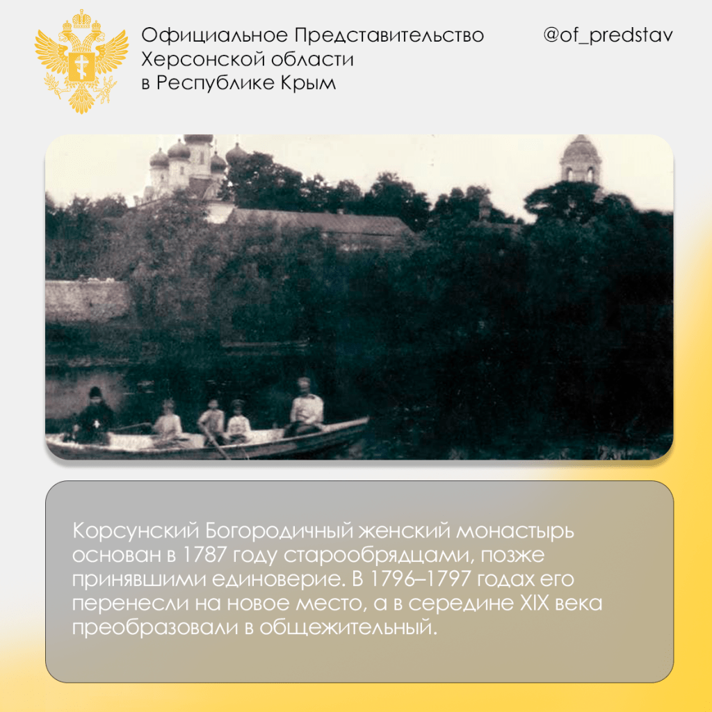Корсунский Богородичный женский монастырь основан в 1787 году русскими старообрядцами, поселившимися на Нижнем Днепре в конце XVIII века и позже воссоединившимися с Православной Церковью на правах единоверия. Первоначально удалённый от реки, монастырь был перенесён на новое место в 1796–1797 годах и в 1847–1849 годах преобразован в общежительный.