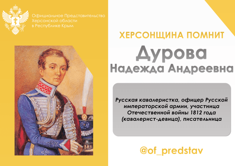 Херсонщина помнит Надежду Андреевну Дурову как выдающуюся фигуру, первую женщину-офицера, чья служба в армии и литературная деятельность оставили заметный след в русской истории.