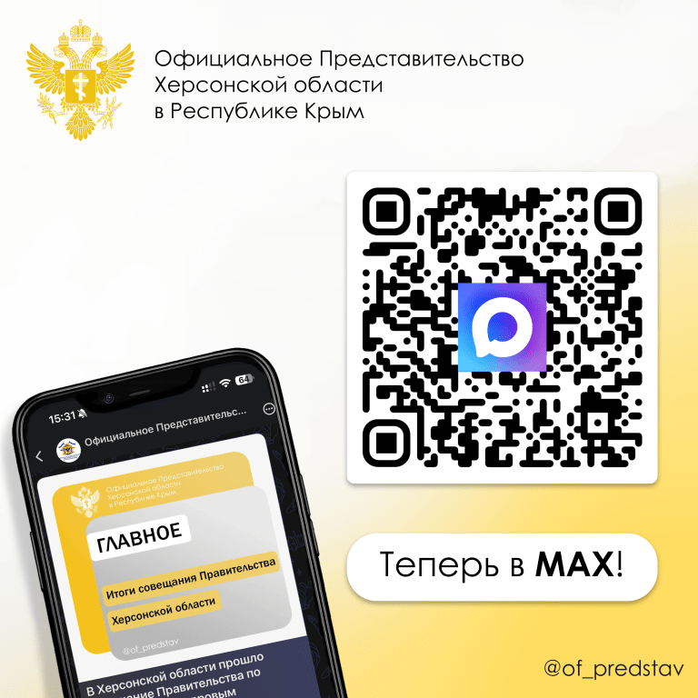 Сообщаем о запуске канала Официального Представительства Херсонской области в Республике Крым в национальном мессенджере MAX.