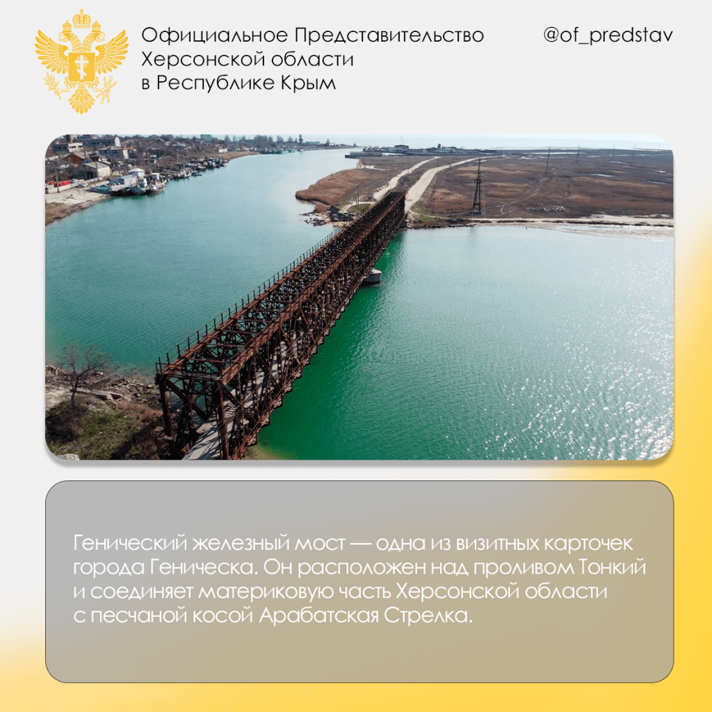 Генический железный мост — одна из визитных карточек города Геническа. Он расположен над проливом Тонкий и соединяет материковую часть Херсонской области с Арабатской Стрелкой.