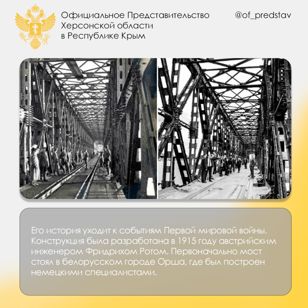 История этого инженерного сооружения уходит к событиям Первой мировой войны. Конструкция была разработана в 1915 году австрийским инженером Фридрихом Ротом. Первоначально мост стоял в белорусском городе Орша, где был построен немецкими специалистами.