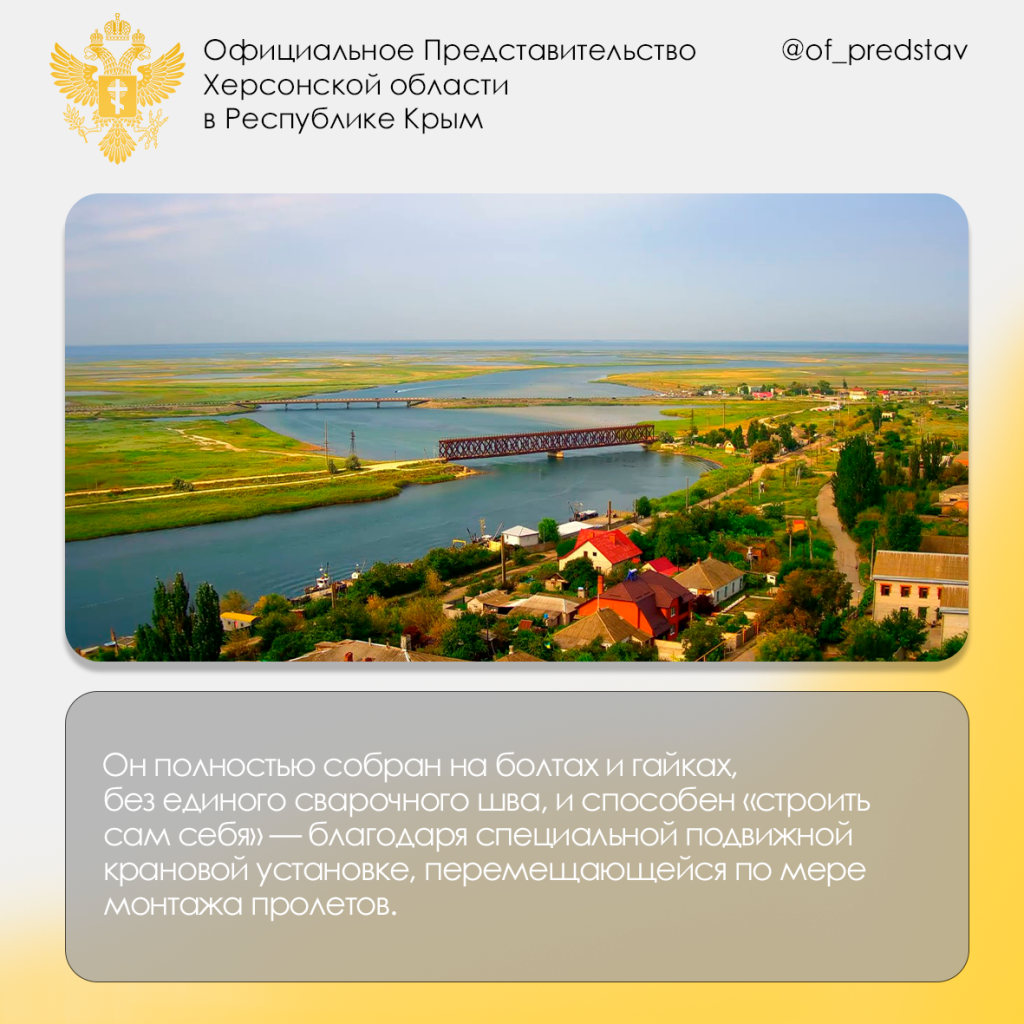 Он полностью собран на болтах и гайках, без единого сварочного шва, и способен «строить сам себя» — благодаря специальной подвижной крановой установке, перемещающейся по мере монтажа пролетов.